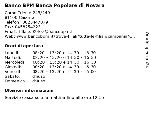 Santa Maria a Vico Banco BPM Piazza Roma 1 81028 Santa Maria a Vico CE. Torre del Greco - Palazzo Vallelonga - Corso Vittorio Emanuele 92100 - Partita Iva. SWIFT Code BCPTITN1061 Breakdown. BANCA POPOLARE DI BARI - AGENZIA DI CASERTA - 180 Corso Trieste - 81100 Caserta CE41071691433938. Indirizzo telefono fax orari di apertura cliente recensioni foto indicazioni stradali e altro ancora.