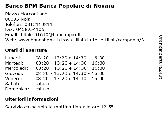 Banca Popolare Di Novara Spa Cigliano CORSO UMBERTO81 orari di apertura banca credito al consumo. Trova gli orari di apertura e di chiusura per Banca Popolare Di Novara a Corso Trieste 245 81100 Caserta Campania e controlla anche gli altri dettagli come ad esempio. A Via Pallanzeno63 28885 Piedimulera Piemonte e controlla anche gli altri dettagli come ad esempio. Mappa numero di telefono sito web. Aprirà tra 9 ore 33 min.