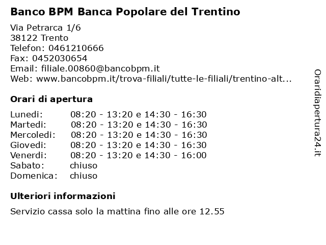Scegliere Banco BPM significa poter contare sulla solidità data dalla nostra storia e su professionisti che continuano a scriverla guardando al futuro. Provincia autonoma di Trento. Insieme a Banco BPM SpA. Cerca banca popolare a Trento TN Trova informazioni indirizzi e numeri di telefono a Trento TN per banca popolare su Paginebianche. Trova tutte le informazioni sulla filiale BancoBPM di TRENTO TN - Via Petrarca 16.