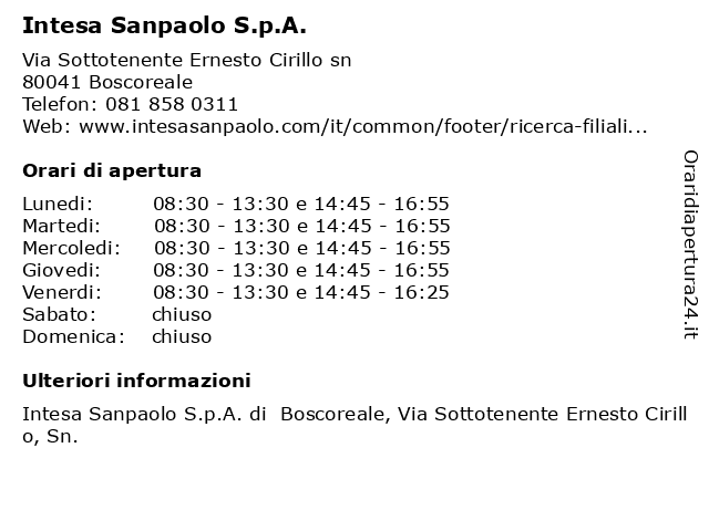Orari di apertura recensioni numero di telefono. Corso Della Repubblica 48-56 03043 Cassino. 0830 13. Trova gli orari di apertura e di chiusura dalla categoria Banca a San Paolo ed altri dettagli come lindirizzo il numero di telefono sito web. Intesa Sanpaolo banche Vicino. Come le altre la Banca Intesa è aperta in generale cinque giorni su sette dal lunedì al venerdì.
